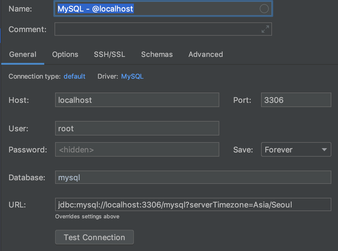 에러조치: Database 부분에 맨뒤에 ?serverTimeZone=Asia/Seoul 이라고 적어준다.